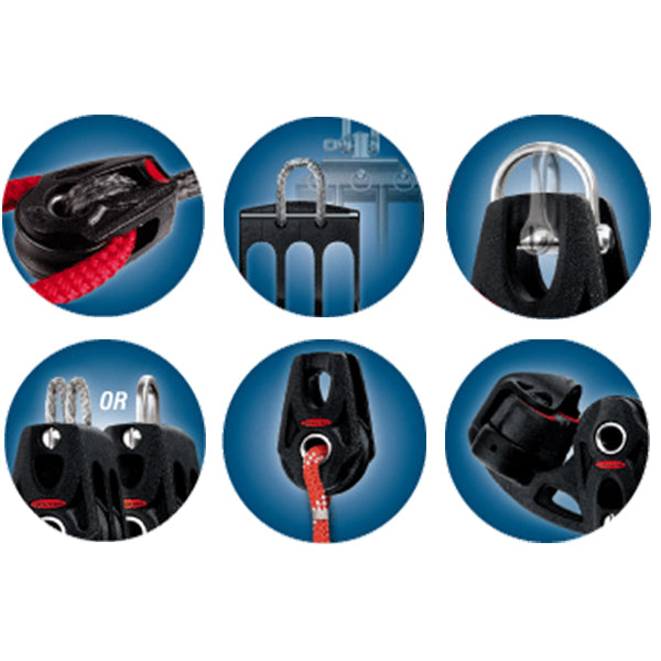 These blocks are far more compatible with Dyneema/Spectra lines, carbon laminate connection points and webbing than traditional blocks with steel loop tops or shackles.