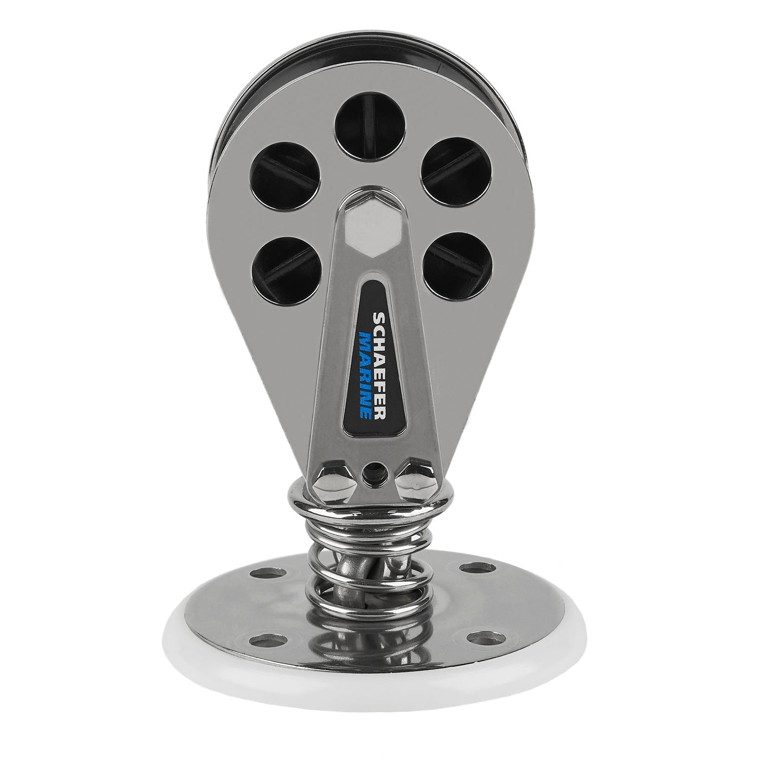 8 Series Stand-up Block with Stainless Steel cheeks. Delrin(tm) sheave run on Nomex(tm)/Teflon(tm) bearing for a very strong yet low-friction sheave. Bolted construction allows for easy maintainence. Use 97-49 (sold sererately) for a solid backing plate. Sheave Dia. 2-3/8" (60 mm), Max Line 9/16" (14 mm), Dia. includes urethane base 3-3/8" (86 mm), Height 4-21/32" (118 mm), H2 2-15/32" (63 mm), Fastener Size (4),1/4" RH (6 mm), C/C 1-11/16" (43 mm), SWL 2750 lbs (1250 kg), Weight Stain. 15.8 oz (448 g)